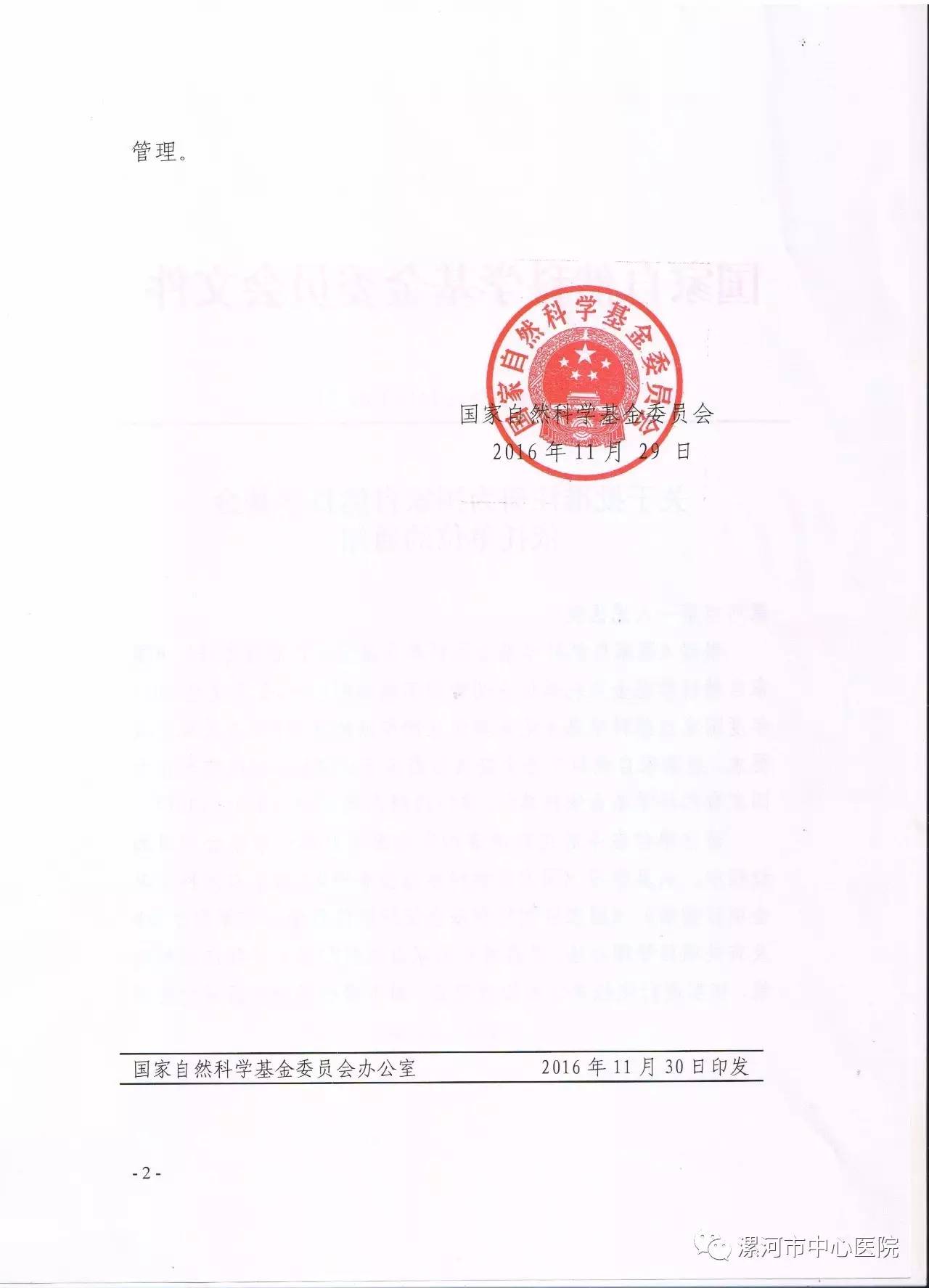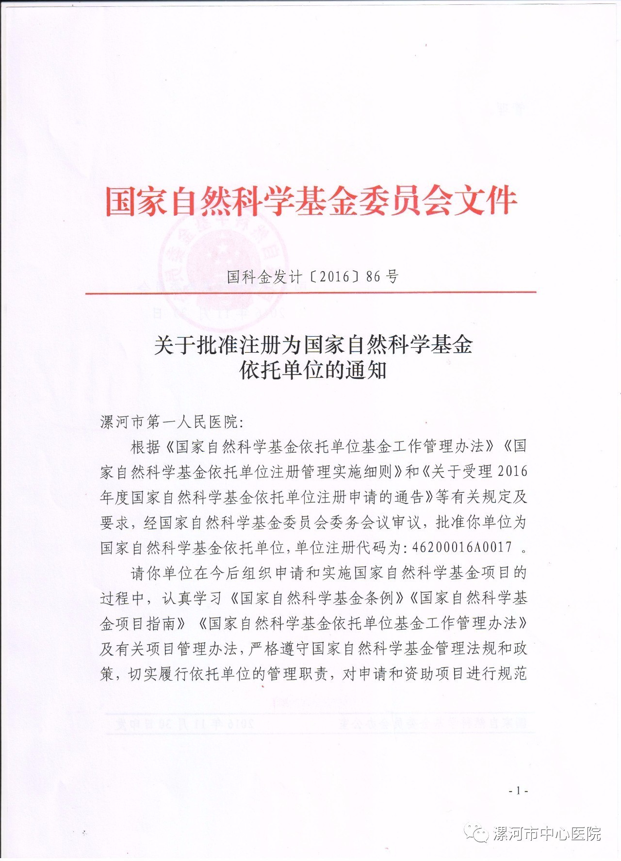 近年来,为进一步拓宽医院科研课题申请渠道,提升医院科研项目的水平与层次,在医院领导的大力支持下,在漯河医专的积极帮助下,市中心医院严格依据有关规定和要求,从基础研究、人才队伍、实验设备、科研管理等方面精心准备申报材料,积极与国家自然基金委沟通,阐明医院在医学科学方面的研究实力和研究条件,并于今年7月向国家自然科学基金委提出了注册为依托单位的申请,成功获得国家自然科学基金依托单位资格,这为市中心医院申报项目开辟了一个新的渠道。