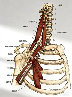 简单来说,胸廓出口是颈肩交界处的一个解剖间隙,其中有支配手臂感觉与运动的重要神经及供应上肢血液的血管通过。当这个空间因各种原因变得狭窄,压迫到神经或血管时,就会引起一系列不适症状,医学上称为胸廓出口综合征。