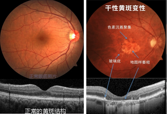 这是较常见的一种,约占90%。其特点是黄斑区感光细胞逐渐萎缩,并出现一些名为“玻璃膜疣”的黄色沉淀物。