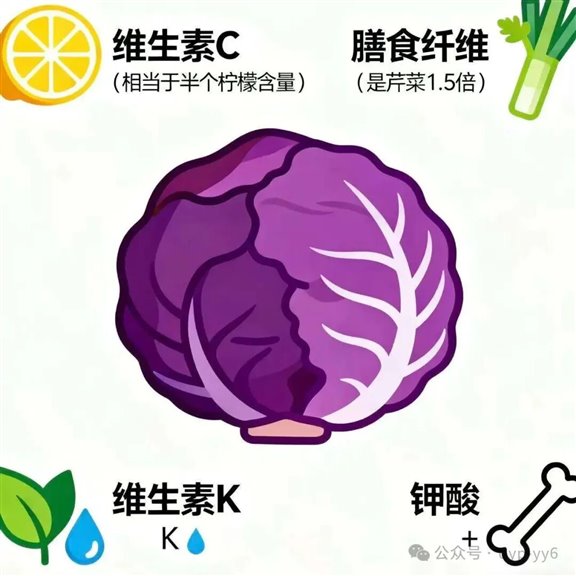 这层紫色花青素可不只是“颜值担当”,更是被现代营养学证实的“抗氧化能手”。它能清除体内自由基,减少紫外线、环境污染对细胞的损伤,延缓皮肤老化;同时还能改善血管弹性,帮助降低血液黏稠度,对心血管健康十分友好。更难得的是,紫甘蓝中的花青素稳定性强,经过烹饪后仍能保留70%以上,比其他富含花青素的蔬果更耐加工。