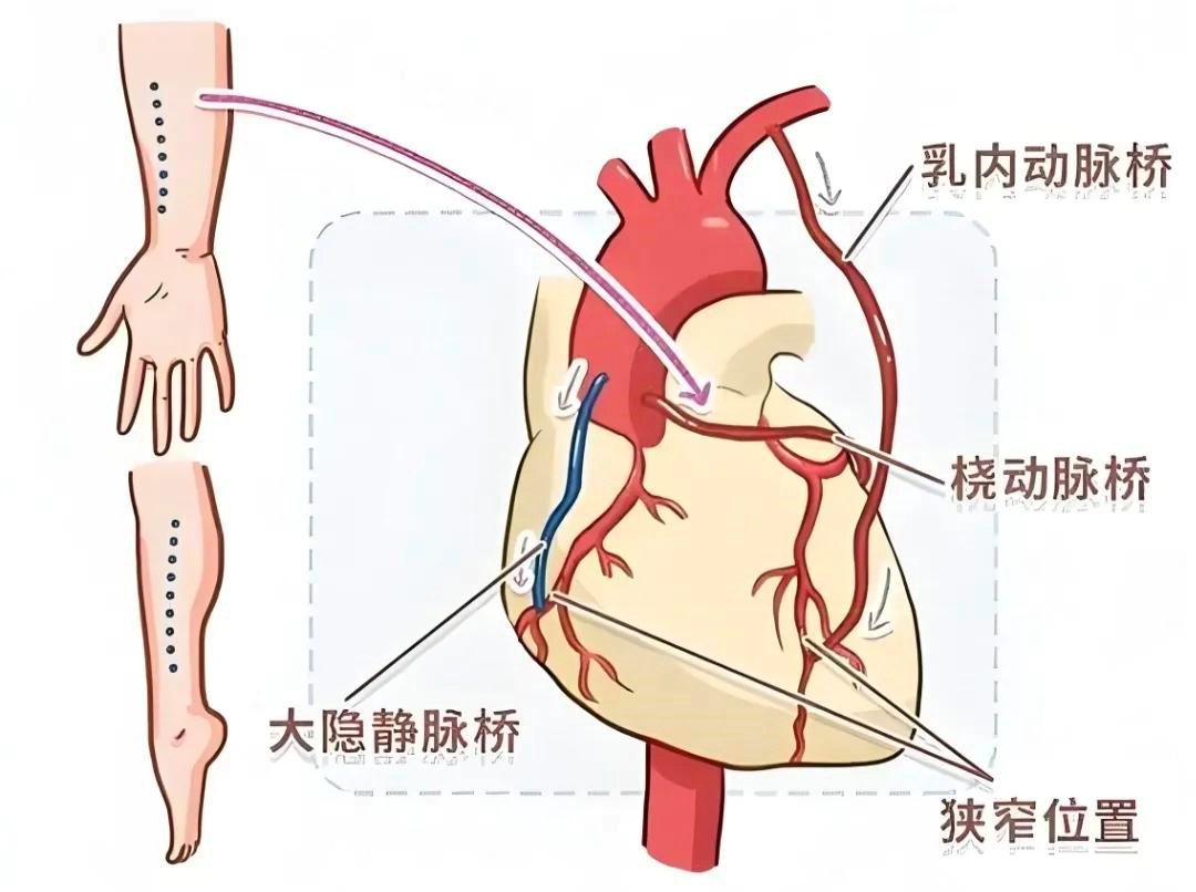 “桥血管”通常取自患者自身,最常用的是胸廓内的乳内动脉(效果持久)和腿部的大隐静脉,有时也会采用手臂的桡动脉。这些血管被取下后,对其功能影响很小。