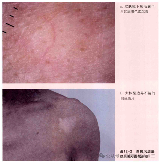 伍德灯下亮蓝白色荧光;皮肤镜、三维皮肤CT可辅助评估复色潜力。