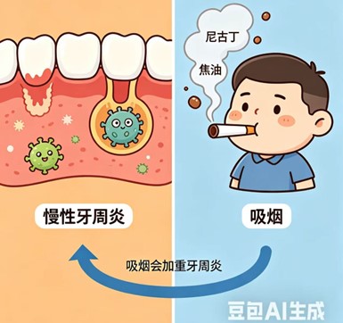 烟草中的尼古丁是一种强烈的血管收缩剂。吸烟后,牙龈的微小血管收缩,血流量减少,可能导致牙周组织的营养供给受限。烟草中的化学物质(焦油、一氧化碳等)可能抑制免疫细胞的功能,有利于细菌繁殖,从而加重牙槽骨的破坏。