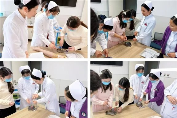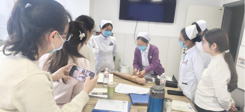 心内六病区护理团队全员参与,分组开展实操练习。静脉治疗专家们通过“一对一”指导,针对导管外露长度测量、透明敷料边缘密封性、冲管手法等细节逐一进行纠正,并分享了处理渗血、过敏等特殊情况的临床经验。赵娟护士长表示:“心血管内科患者常需长期用药,PICC使用率较高,此次指导帮助我们梳理了操作中的盲点,对提升专科护理水平和质量具有重大意义。”