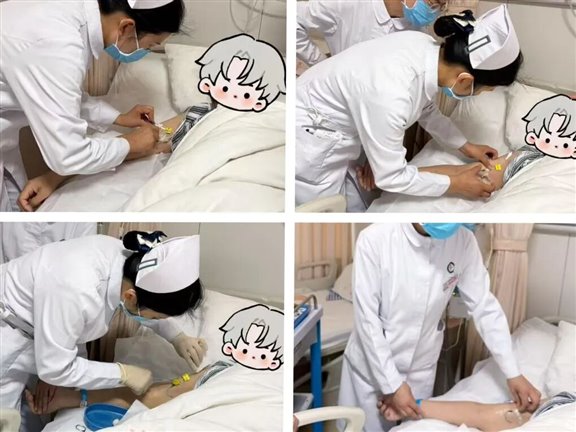 理论讲解后,张晓争护理骨干深入病房开展实操带教,严格遵循手卫生、敷料移除、皮肤消毒、规范固定、脉冲式冲封管至记录核对的全流程标准操作。强调:“导管固定既是技术操作,更是患者安全的核心保障,不规范固定可能导致导管移位、脱出,甚至引发感染或血栓等严重并发症。”随后通过实操演示“无张力粘贴”“蝶形交叉固定”等关键技术,重点讲解皮肤完整性评估、个性化敷料选择及肢体活动指导要点,有效规避因固定不当导致的皮肤损伤与导管牵拉风险。