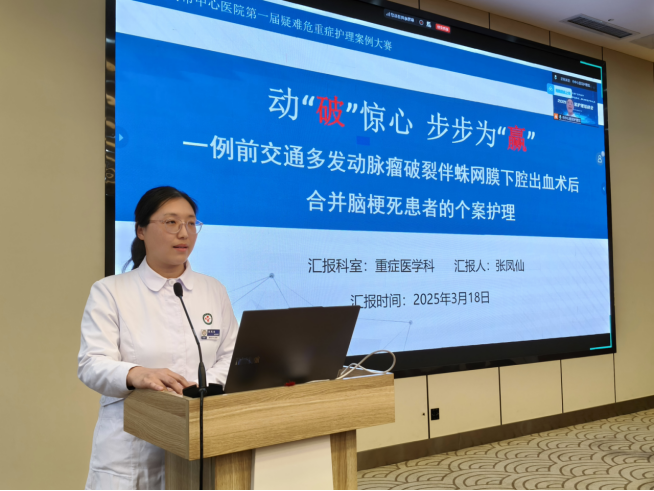 随后,漯河市中心医院第一届疑难危重症护理案例大赛第一名获得者、重症医学科业务骨干张凤仙主管护师进行了优秀个案展示。她以《动“破”惊心,步步为“赢”——一例前交通多发动脉瘤破裂伴蛛网膜下腔出血术后合并脑梗死患者的个案护理》为题,还原了这场与死神的惊心较量。从患者急诊入院时的险象迭生,到动脉瘤夹闭术后的柳暗花明;从突发瞳孔散大、大面积脑梗死的雪上加霜,到去骨瓣减压后的步步为营——张凤仙老师以时间为主轴,以问题为导向,生动呈现了ICU护理团队如何在病情瞬息万变中精准预判、从容应对。她重点分享了“四大护理关键模块”和“三个关键举措”:骨窗护理“洞”观其变、脑室引流管的精细化管理、高质量目标体温控制,充分展现了重症护理人的专业底蕴与临床智慧。